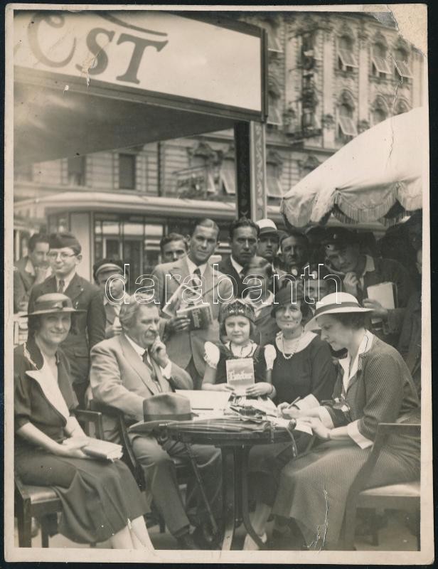 cca 1930-1940 Budapest, Móricz Zsigmond az Est teraszán, mellette feltehetőleg Börcsök Erzsébet (1904-1971) vajdasági magyar író Eszter c. regényét dedikálja, Solty Kató pecséttel jelzett fotója, felületi sérülésekkel, 15×11,5 cm