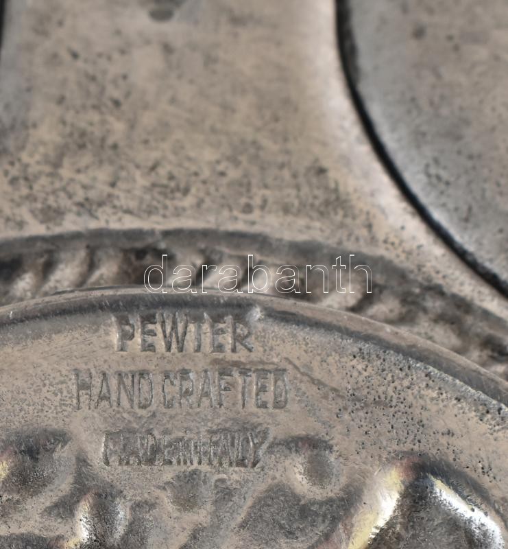 Széder tál. Ón, jelzett, Olaszország, XX. század. Apró sérülésekkel. d: 38 cm A szédertálon az est jelképei szerepelnek. Három pászka a zsidó nép három rétegét, akohánitákat, lévitákat és Jiszráélt, az egyszerű zsidókat jelzi. Egy keménytojás a Szentély idejében szokásos chágigá áldozatra emlékeztet. Ezzel átellenben foglal helzet a zroá, a sült csirkenyak, a Peszách-bárányáldozat szimbóluma. Ott van még a kárpász (főtt krumpli vagy egy hagyma), valamint a máror és a cházeret - a kétféle keserű gyökér, rendszerint reszelt torma és fejes saláta - meg a chároszet, a gyümölcspépből készült keverék, amely az egyiptomi rabszolgaságból emlékezetes maltert jelképezi.