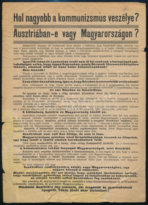 1921 Soproni népszavazás plakátja Hol nagyobb a kommunizmus veszélye? Ausztriában-e vagy Magyarországon? Ausztria melletti kiállás. Szakadással 20,5x29 cm / 1921 Hungarian language propaganda of the Sopron referendum in favor for Austria. With tears 20,5x29 cm