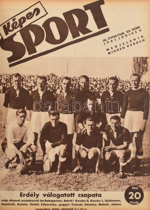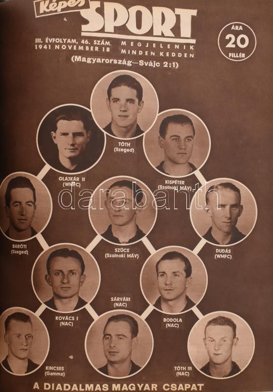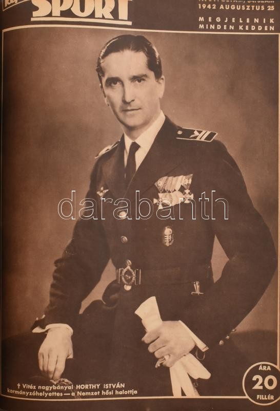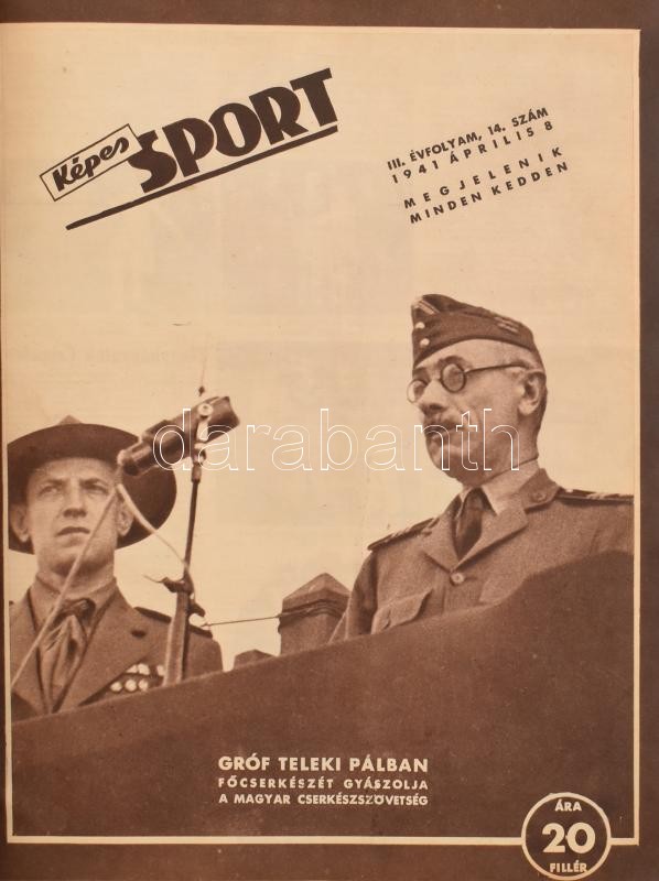 1941-1942 Képes Sport III. évf. 1-52. sz., 1941 jan. 8.-dec. 30., és IV. évf. 1-51. sz., 1942. jan. 6.-dec 22. III teljes és IV. majd nem teljes évfolyam (csak 1! szám hiányzik. Nagyon gazdag képanyaggal illusztrált. Korabeli reklámokkal, érdekes írásokkal. A címlapok között Teleki Pál és vitéz Horthy István emlékező gyászkeretes címlapokkal is, bennük róluk szóló írásokkal, fotókkal. Átkötött félvászon-kötésben, kopott borítóval, a könyvtáblák meglazultak, egy-két kisebb szakadással, de belül alapvetően jó állapotban.