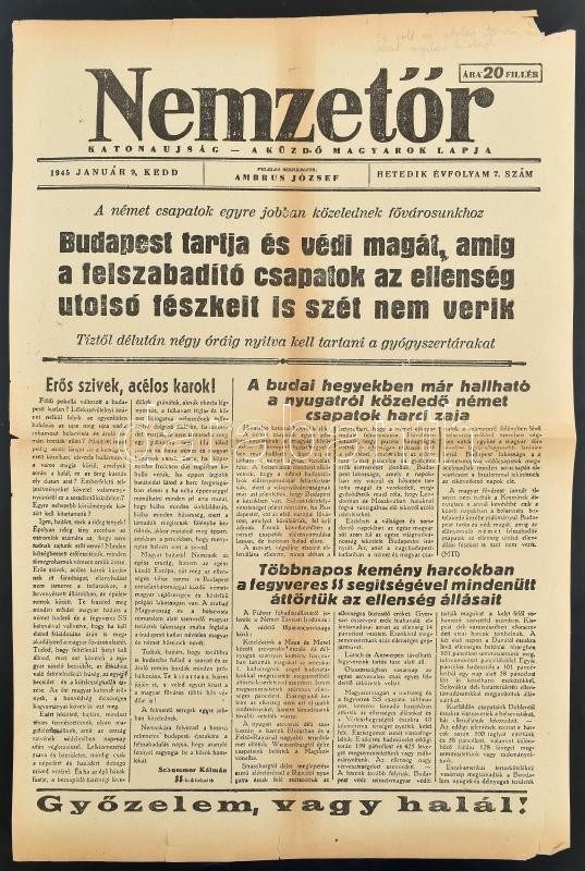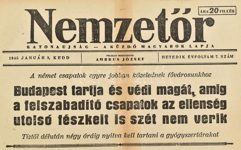 1945. 01.09. A Nemzetőr c. nyilas katonaújság VII. évf 7. száma a körü... https://www.darabanth.com/hu/36-Nagyaukcio/36.1/Mutargy-papirregiseg-egyeb/Nyomtatvanyok~15522/1945-0109-A-Nemzetor-c-nyilas-katonaujsag-VII-evf-7-szama-a-korulzart-Budapestrol~II2487857