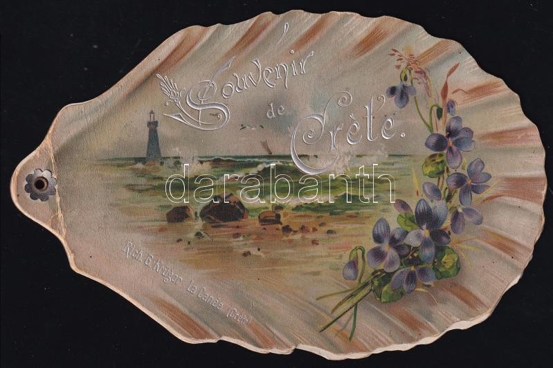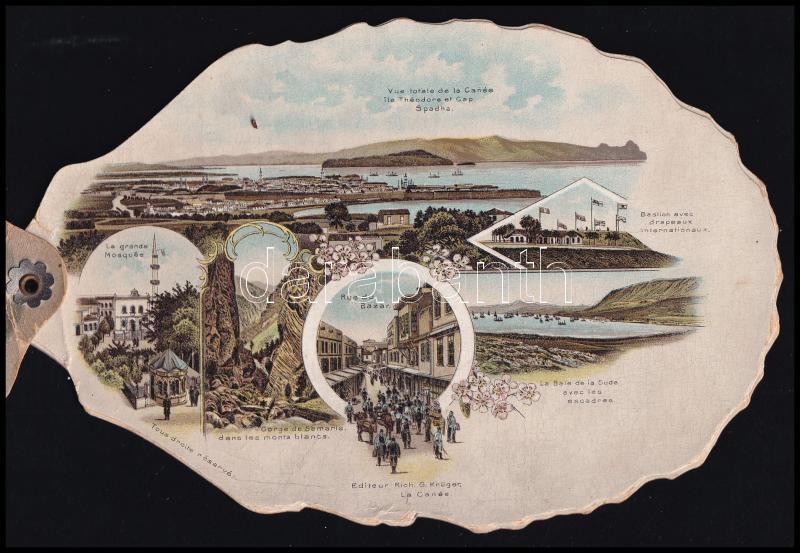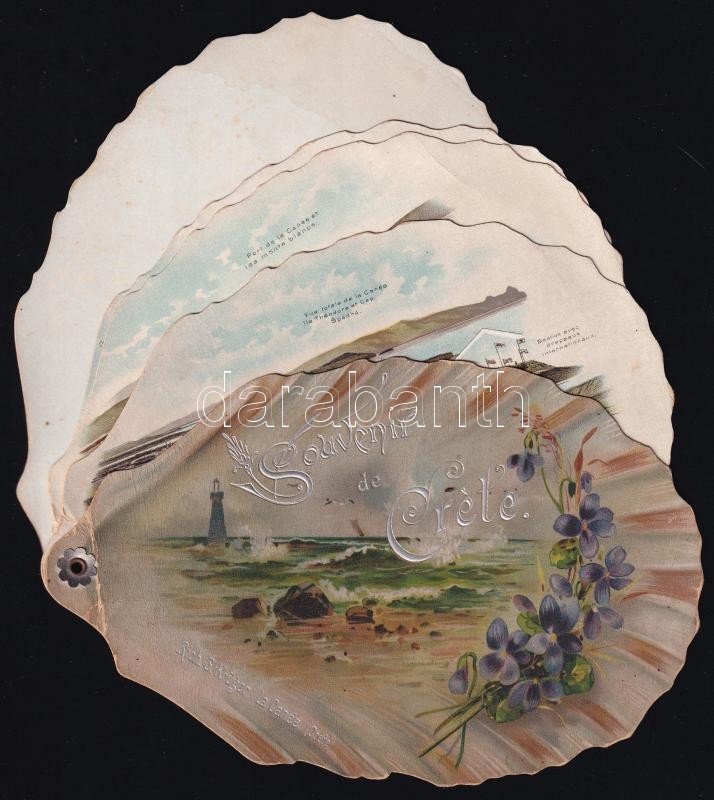 cca 1900 Souvenir de Créte / Krétai emlék, szecessziós, kagyló formájú, litho képes füzet, Rich. G. Krüger La Canée (Créte), 5 p., kisebb törésnyomokkal