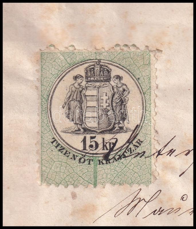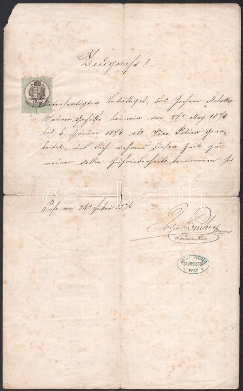 Leírás: 1874 Josef Pucher építőmester aláírása német nyelvű munkáltatói igazoláson, 15 kr okmánybélyeggel