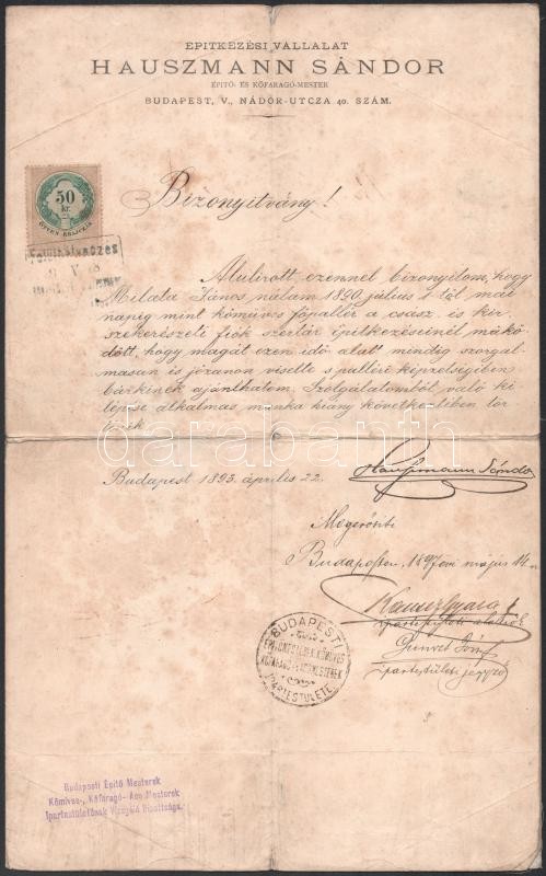 Leírás: 1893 Bp., Hauszmann Sándor (1848-1906), Hauszmann Alajos unokatestvérének fejléces levélpapírjára írt munkáltatói igazolás 50 kr okmánybélyeggel, Hauszmann Sándor saját kezű aláírásával