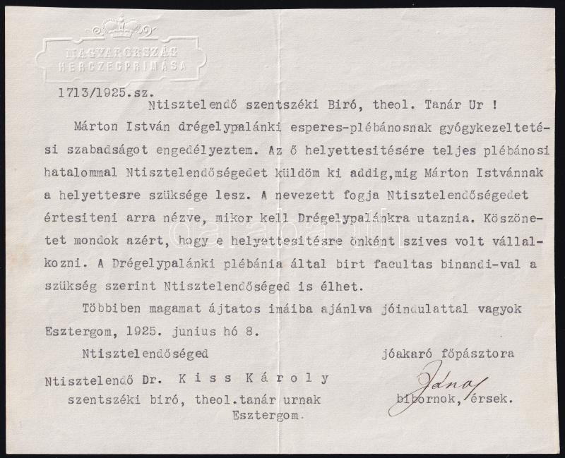 Leírás: 1925 Esztergom, Csernoch János (1852-1927) esztergomi érsek, bíboros-hercegprímás által aláírt levél, dombornyomott fejléces levélpapíron