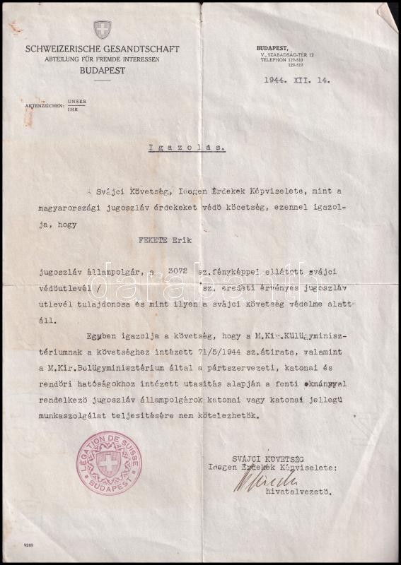 1944 A svájci követség mint a jugoszláv érdekek képviselőjének igazolása magyar származású, jugoszláv állapolgár részére. Schutzpass . / Swiss Schutzpass for Jugoslavian - Hungarian person
