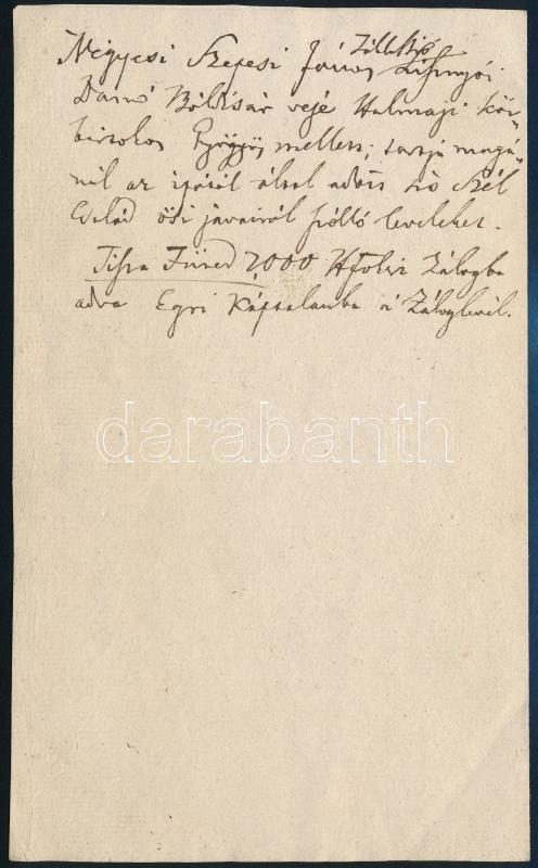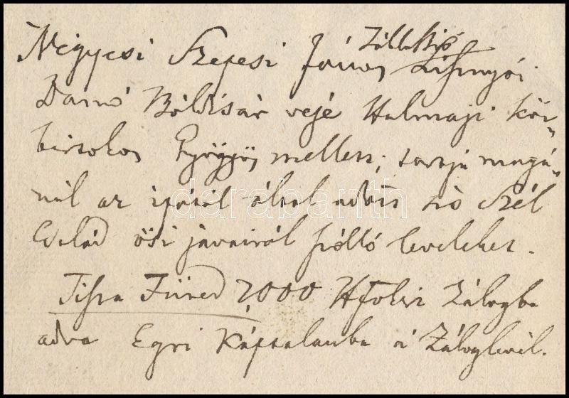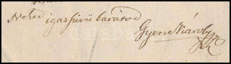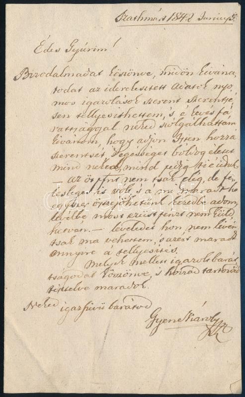 1842 Gyene Károly (1805-1878) országgyűlési képviselő, újságíró autográf levele Szél Györgynek, Szél Kálmán (1838-1928) református esperes, Arany János veje apjának. A levélben gyenes megköszöni a kölcsönt, valamint egy másik oldalán fejlezsét tartalmaz Szél család ősi jussát igazoló levelekről.