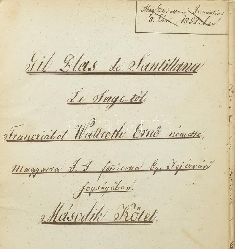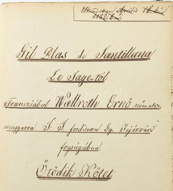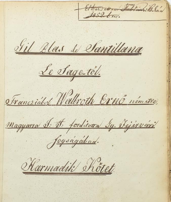 1851-1852 Incze József (1797-1886) honvéd százados kézirata: (Alain René) Le Sage: 'Gil Blas' c. regényének, Wallroth ErnÅ‘ német szövege utáni fordÃtása, amelyet a gyulafehérvári fogsága idején fordÃtott 1851-1852 között. Incze József az 1848-1849-e szabadságharcban a kézdivásárhelyi hadbÃróság elnöke, amiért elÅ‘bb halálra, majd 4 év várfogságra Ãtélték. Öt kötetbe kötve, egyenként mintegy 140 oldal terjedelemben, az 1. kötet borÃtója a gerincen szakadt, foltos borÃtókkal.