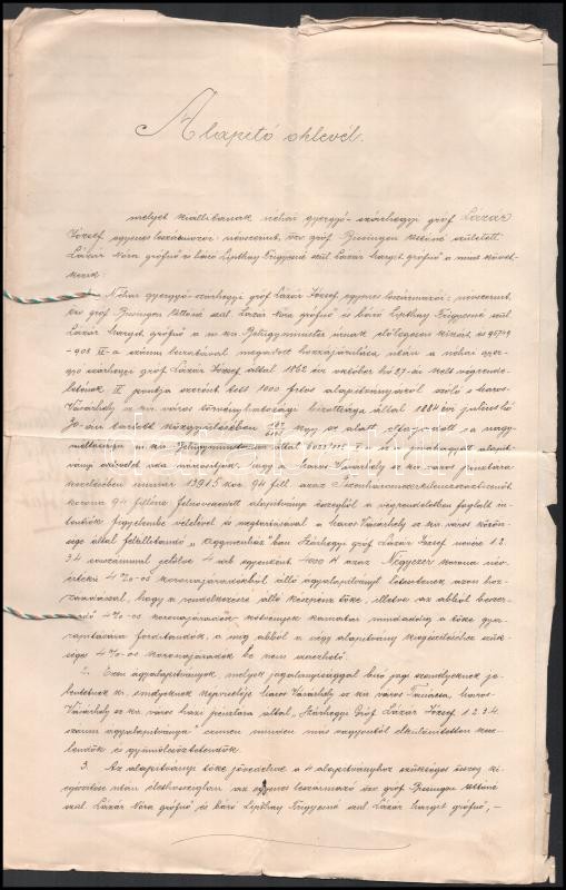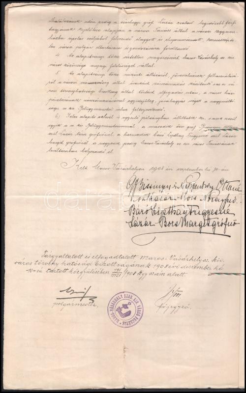 1908 Szegény nyomorék férfiak befogadására alkalmas menház alapÃtványi oklevél gyergyószárhegyi gróf Lázár József végrendeleti akaratából, korabeli hiteles másolat, grófnÅ‘k, bárónÅ‘k Liphtay, Bors, Wissinger, Nippenburg eredeti aláÃrásaival, Marosvásárhely szabad kir. város pecsétjével 8p.