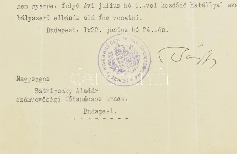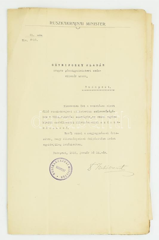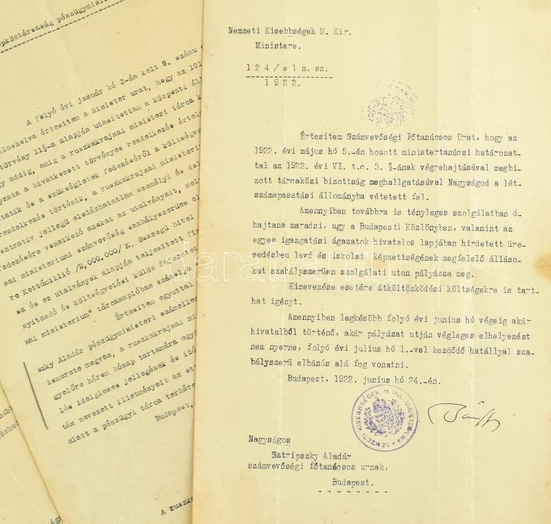1919-1922 Sztripszky Aladár magyar pénzügyminisztert számellenőr levelezése a ruszkakrajnai miniszterrel és a Nemzeti Kisebbségek M. Kir. Minisztériumával, 5 db