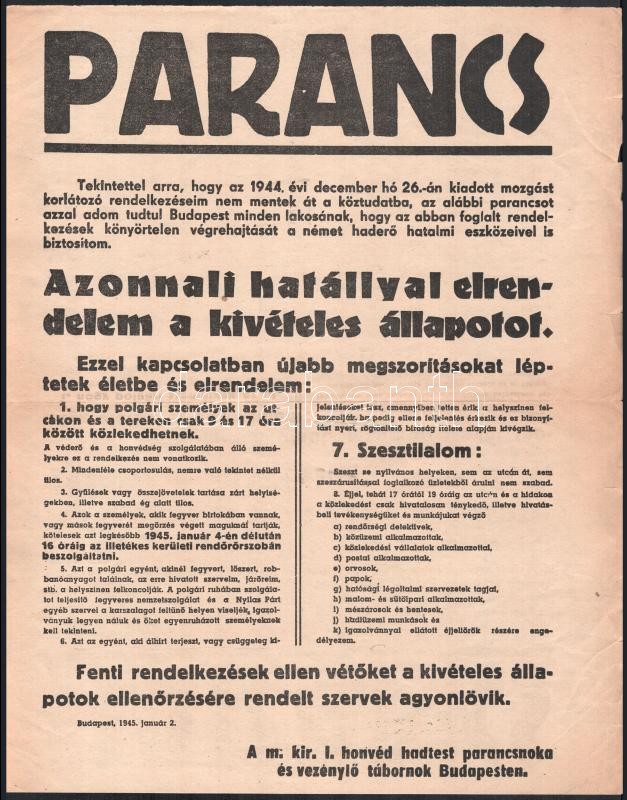 1945. I. 2. Budapest kijárási- és szesztilalom bevezetéséről szóló kat... https://www.darabanth.com/hu/36-Nagyaukcio/36.1/Mutargy-papirregiseg-egyeb/Tortenelmi-dokumentumok-keziratok-erdekessegek~15279/1945-I-2-Budapest-kijarasi-es-szesztilalom-bevezeteserol-szolo-katonai-rendelet-hirdetm~II2487394