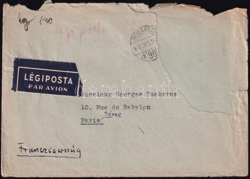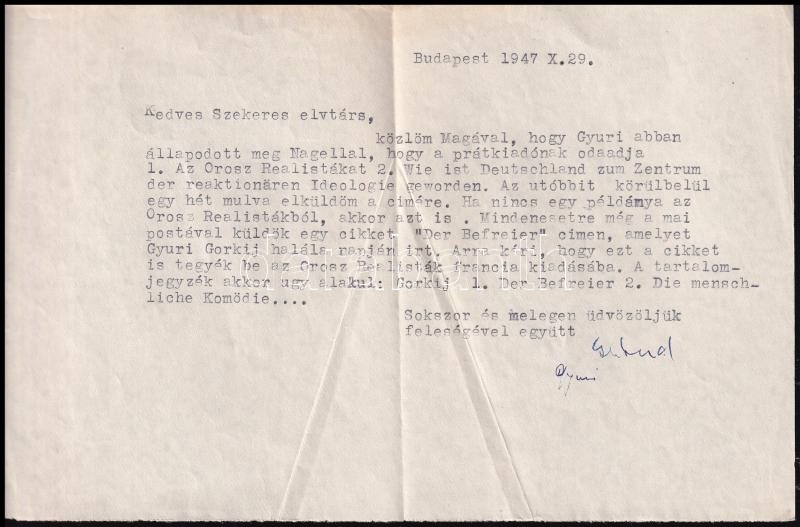 1947 Lukács György (1885-1971) filozófus gépelt levele, (felesége (Lukács Györgyné Jánosi Gertrud (1882-1963) írta a nevében), Szekeres György (1914-1973) újságíró, műfordító, az Európa Kiadó későbbi főszerkesztője részére, Budapestről Párizsba, saját kezű aláírásaikkal (Gyuri, Gertrud.)