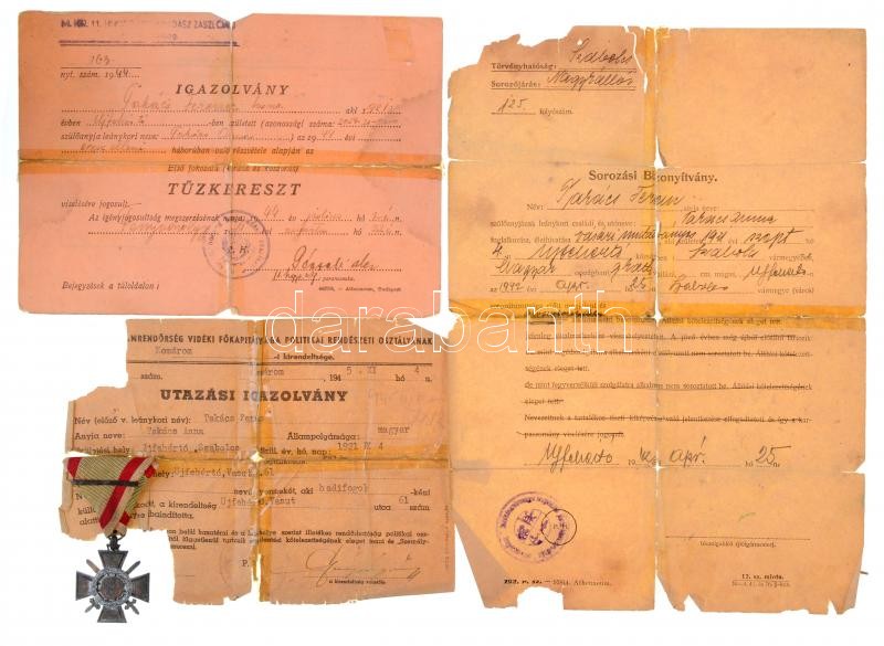 Leírás: 1943. "Tűzkereszt I. fokozata" oxidált hadifém kitüntetés mellszalaggal, sebesülési pánttal, viselési és utazási igazolvánnyal, sorozási bizonyítvánnyal T:2,2- okiratok ragasztva / Hungary 1943. "Hungarian Fire Cross 1st class" oxidized war metal decoration with ribbon and wound strap, with wearing, travelling and enrolling certificates C:XF,VF documents taped NMK 443.