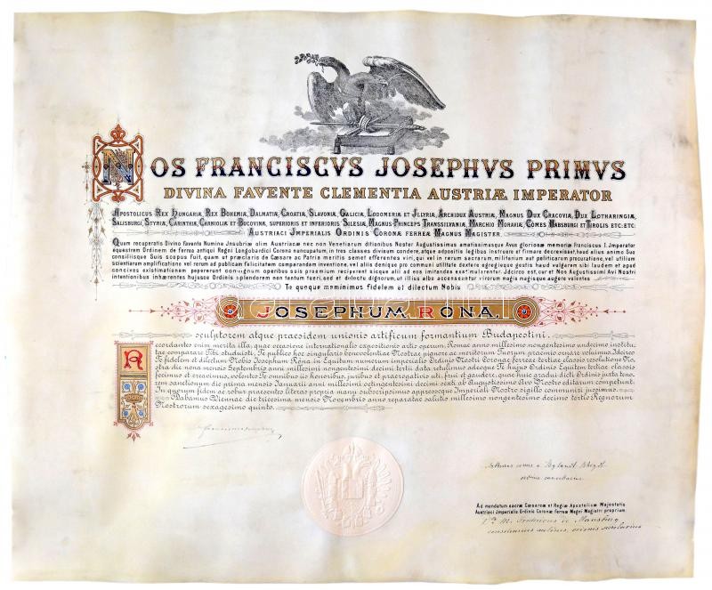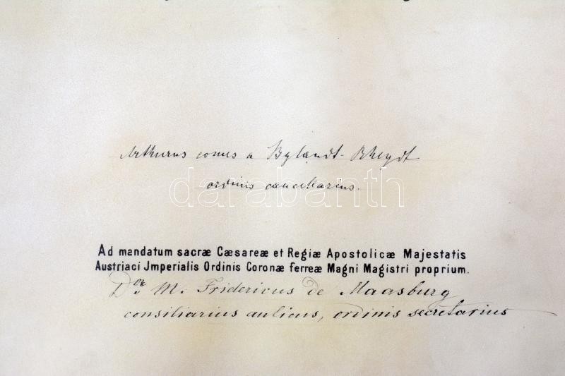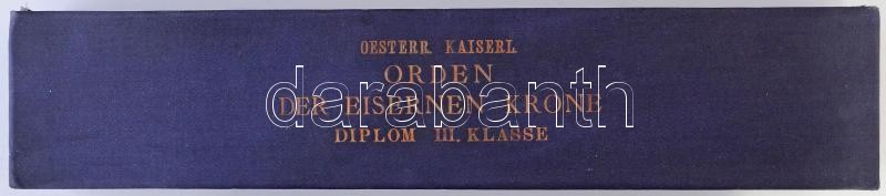 Osztrák Magyar Monarchia 1913. "Vaskorona Rend III. osztálya" adományozói oklevele, pergamenre írva, Ferenc József aláírásával, nagyméretű szárazpecséttel, eredeti sötétkék "OESTERR. KAISERL. ORDEN DER EISERNEN KRONE DIPLOM III. KLASSE" adományozói tokban T:I- a pergamen szélén ujjlenyomat / Austro-Hungarian 1913. Award document for the "Order of the Iron Crown, 3rd Class" written on parchment with hand-written signature of Franz Joseph and large-size embossed stamp. In original deep blue "OESTERR. KAISERL. ORDEN DER EISERNEN KRONE DIPLOM III. KLASSE" display case C:AU parchment edges with fingerprints