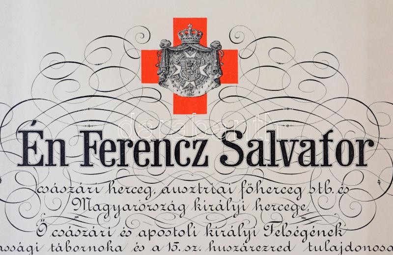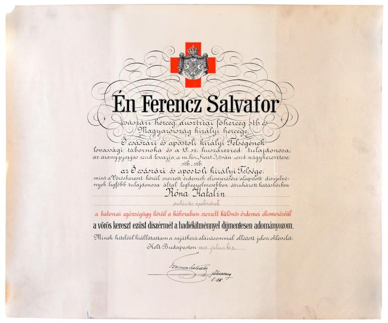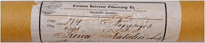 Osztrák-Magyar Monarchia 1916. "A Vörös Kereszt Ezüst Díszérme hadidíszítménnyel" kitüntetés adományozó oklevele Ferenc Salvator főherceg facsimile aláírásával, az eredeti postai csomagküldő hengerben felcsavarva T:I- / Austro-Hungarian Monarchy 1916. Award document for the "Red-Cross Silver Medal with military ornament" decoration with facsimile sign of Duke Franz Salvator, in the original Postal Cylinder C:AU