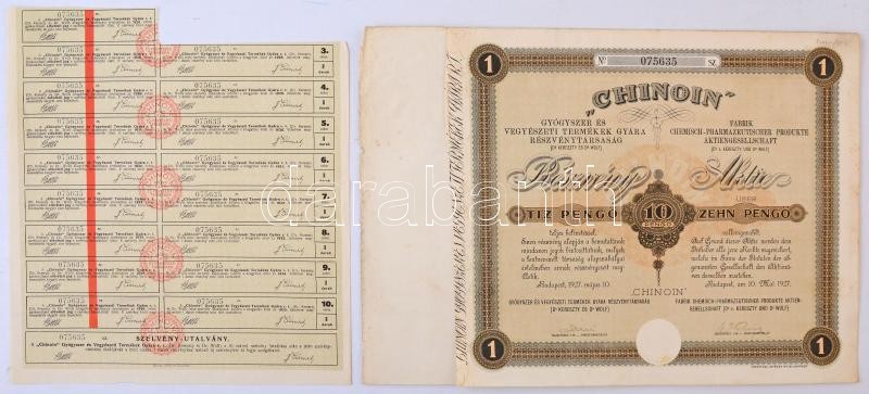 Budapest 1927. "Chinoin - Gyógyszer és Vegyészeti Termékek Gyára Részvénytársaság" részvény 10P-ről, szelvényekkel, szárazpecséttel, magyar és német nyelven T:II / Hungary / Budapest 1927. "Chinoin - Gyógyszer és Vegyészeti Termékek Gyára Részvénytársaság" share about 10 Pengő, with coupons, embossed stamp, in hungarian and german language C:XF