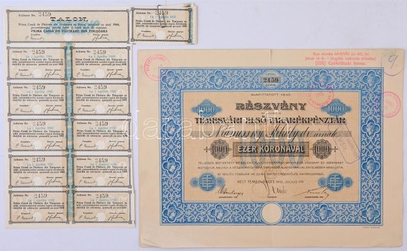 Temesvár 1910. "Temesvári Első Takarékpénztár" névre szóló részvénye 1000K-ról szelvényekkel, szárazpecséttel, felülbélyegzésekkel T:III szakadásokkal / Hungary / Temesvár 1910. "Temesvári Első Takarékpénztár" share with shareholder's name about 1000 Korona, with coupons, emobssed stamp and overprint C:F tears