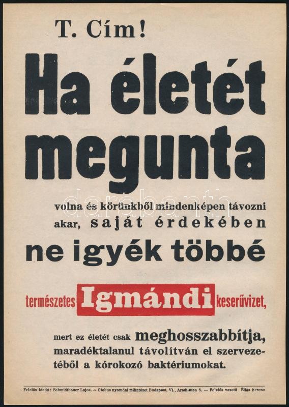 cca 1920-1930 "Ha életét megunta volna és körünkből mindenképen távozni akar, saját érdekében ne igyék többé természetes Igmándi keserűvízet...", Schmidthauer-féle Igmándi keserűvíz reklám-, villamosplakát, Bp., Globus-ny., jó állapotban, 24x17 cm