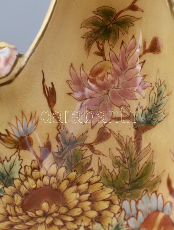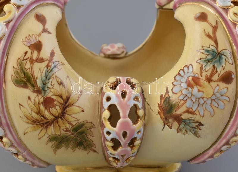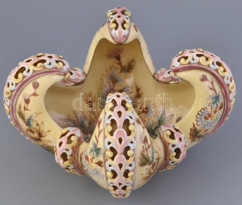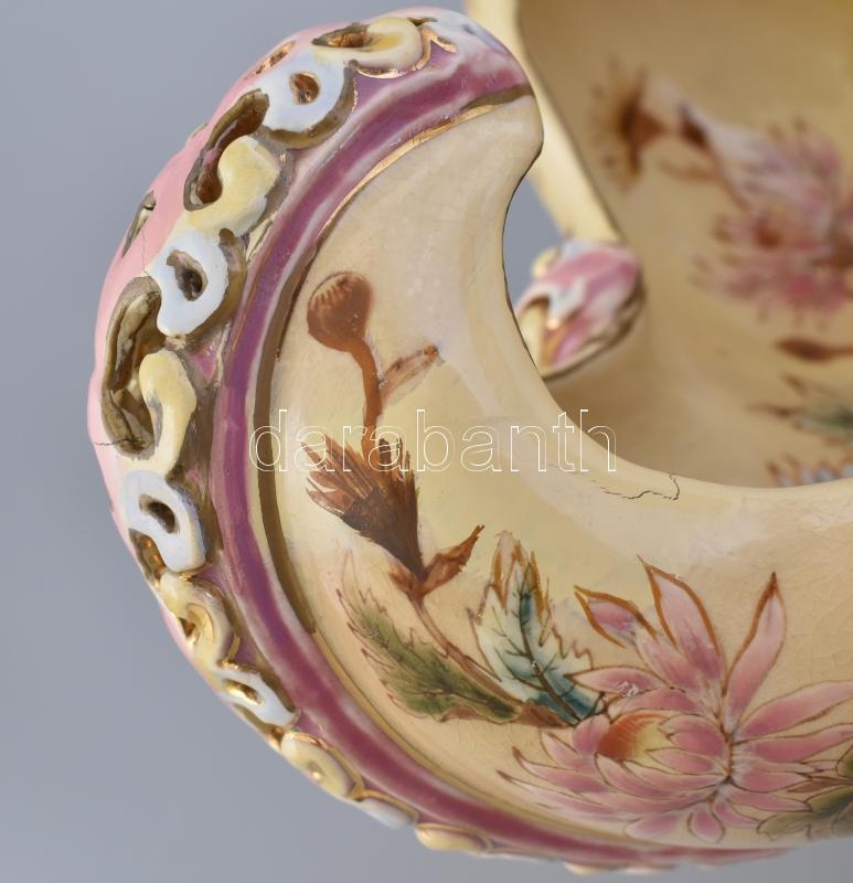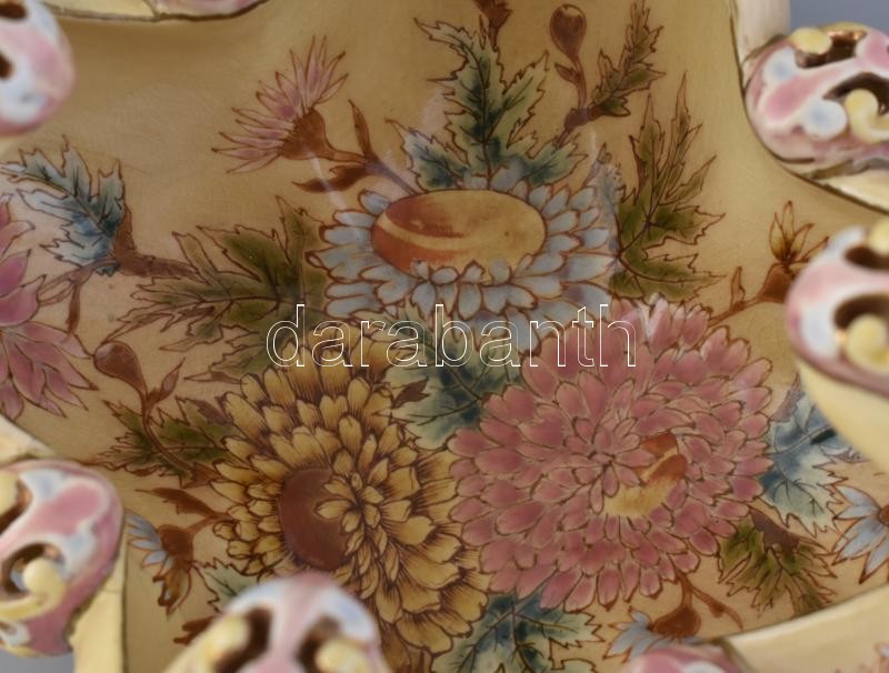 Porcelánfajansz, kívül- belül színesen festett virágmintás, külső részén duplafalú áttört díszítéssel.