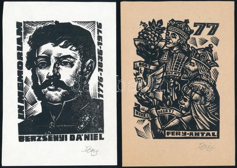 Leírás: Fery Antal (1908-1994): 2 db ex libris, fametszet, papír, jelzett, 14,5×10 cm