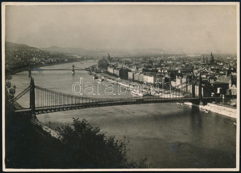 Leírás: 1929 Kinszki Imre (1901-1945) budapesti fotóművész pecséttel jelzett vintage fotóművészeti alkotása (Látkép a Gellért-hegyről), 12,5x17,5 cm