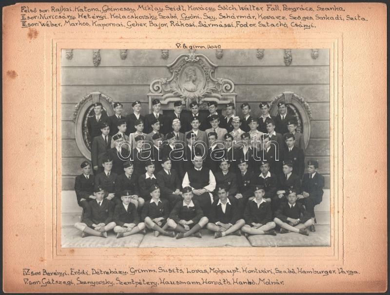 Leírás: 1940-1941 A Ciszterci Rend Szent Imre Gimnáziumának csoportképe, kartonra kasírozott fotó Molnár Erzsi műterméből, pecséttel jelzett, 17×23 cm