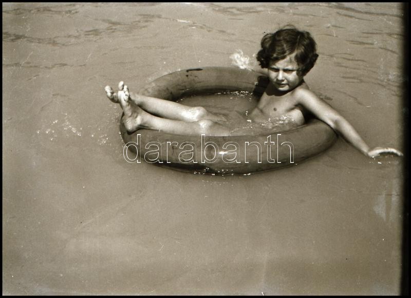 Leírás: cca 1931 Kinszki Imre (1901-1945) budapesti fotóművész hagyatékából, jelzés nélküli vintage negatív (Kinszki Gáborka dunai fürdőzése), 4,4x5,8 cm