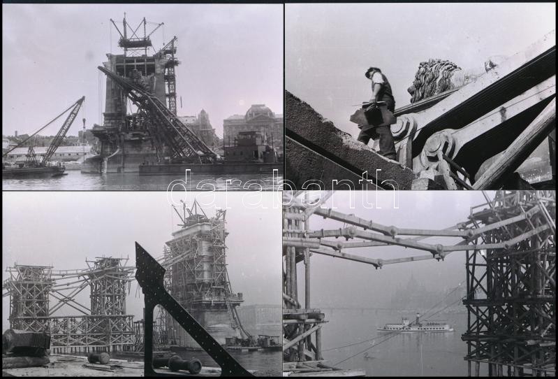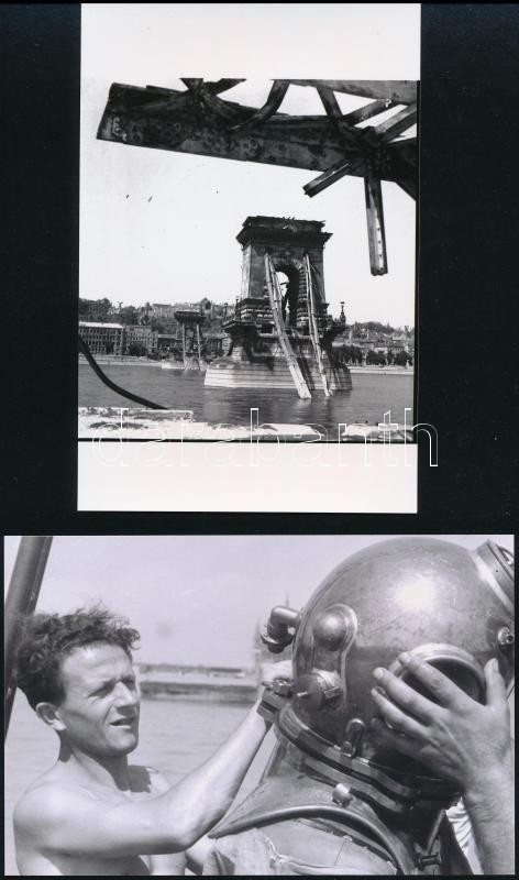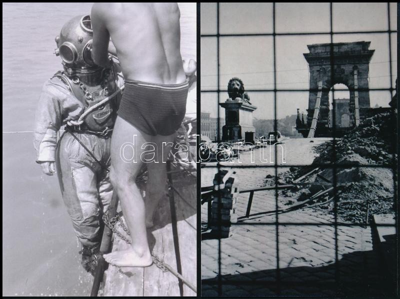 cca 1945 Budapest, a németek által felrobbantott Lánchíd romjainak bontása és a Duna medrének hajózhatóvá tétele, 8 db mai nagyítás korabeli negatívokról, 10x15 cm
