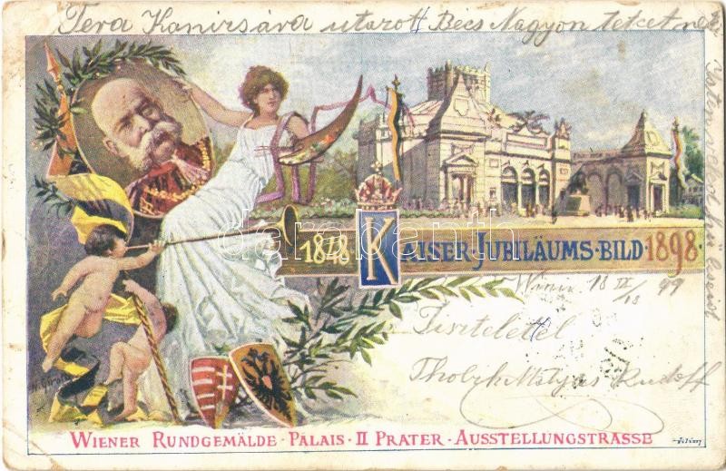 1899 Wien, Vienna, Bécs II. Wiener Rundgemälde Palais, Prater, Ausstellungsstrasse. 1848-1898 Kaiser Jubiläums Bild / 50th anniversary of Franz Joseph's reign (EK)