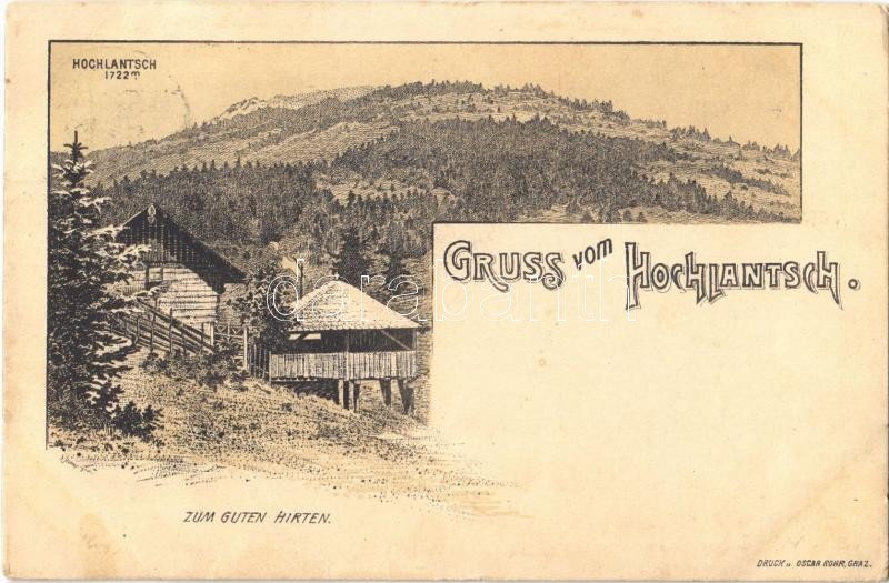 Leírás: 1902 Hochlantsch, zum guten Hirten 1722 m. / mountain peak, chalet. Druck Oscar Rohr. Art Nouveau, litho (fl)
