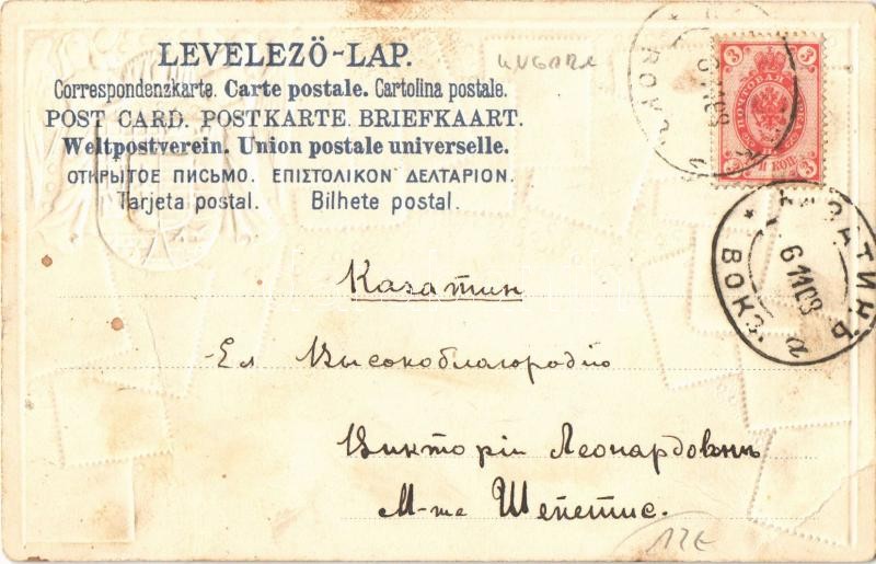 Leírás: 1908 A Magyar Kir. Posta bélyegei / set of Hungarian stamps, coat of arms. Ottmar Zieher's Philatelie Ansichtskarte No. 16. Emb. litho (EK)