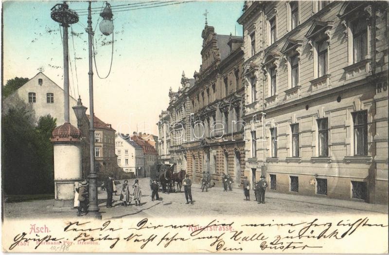 1905 As, Asch; Kaiserstrasse, Hotel Geyer / street (EK) https://www.darabanth.com/hu/360-Gyorsarveres/360.0/Kepeslapok/Cseh-Koztarsasag~1000023/1905-As-Asch-Kaiserstrasse-Hotel-Geyer-street-EK~II2073291