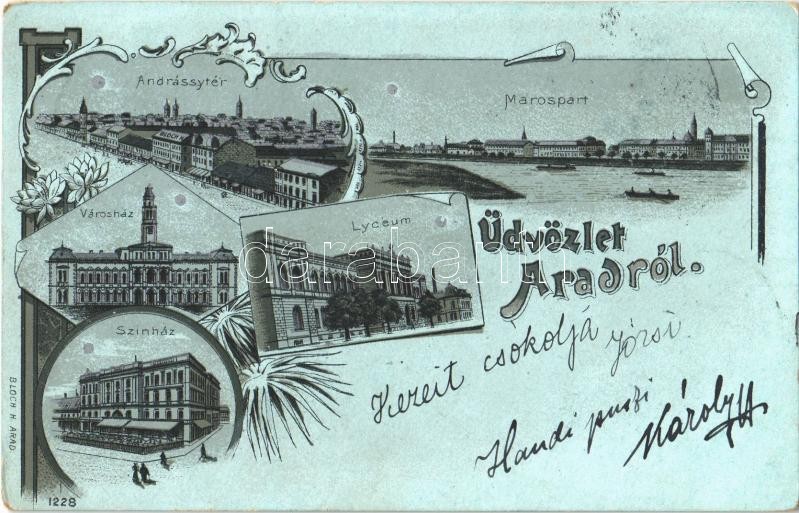 1900 Arad, Andrássy tér, Városház, Színház, Lyceum, Maros part / square, Mures riverside, theatre, town hall, school. Bloch H. Art Nouveau, floral, litho