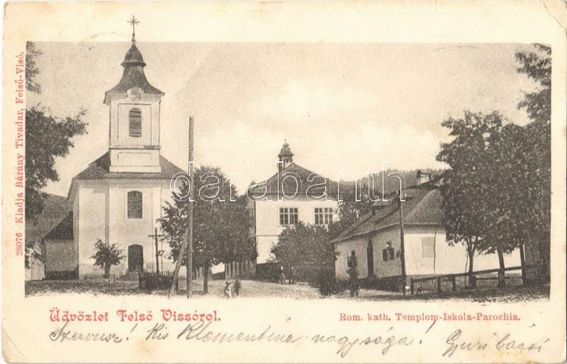 Leírás: 1900 Felsővisó, Viseu de Sus; Római katolikus templom, iskola és parókia. Kiadja Bárány Tivadar / Catholic church, school, parsonage (EK)