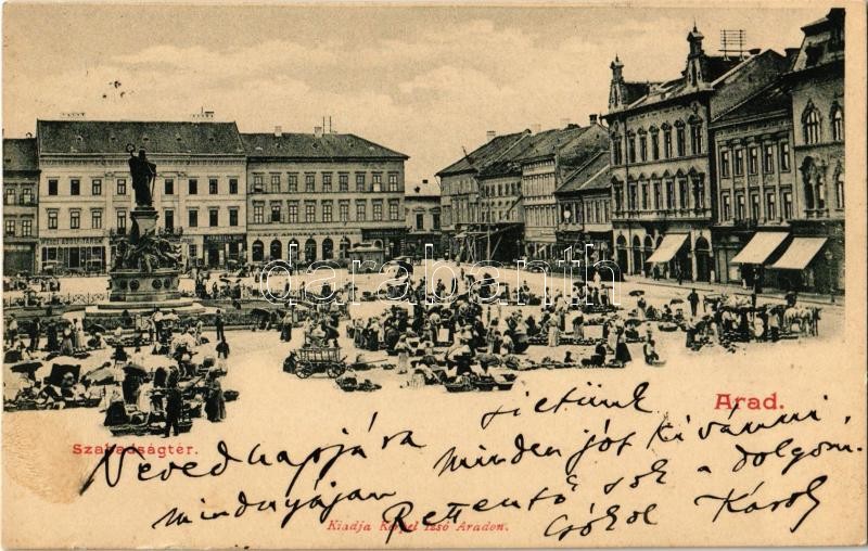 Leírás: 1902 Arad, Szabadság tér, piac, Abbazia Kávéház, Weigl Adolf és Társa, Herbstein Mór üzlete / square, market, cafe, shops