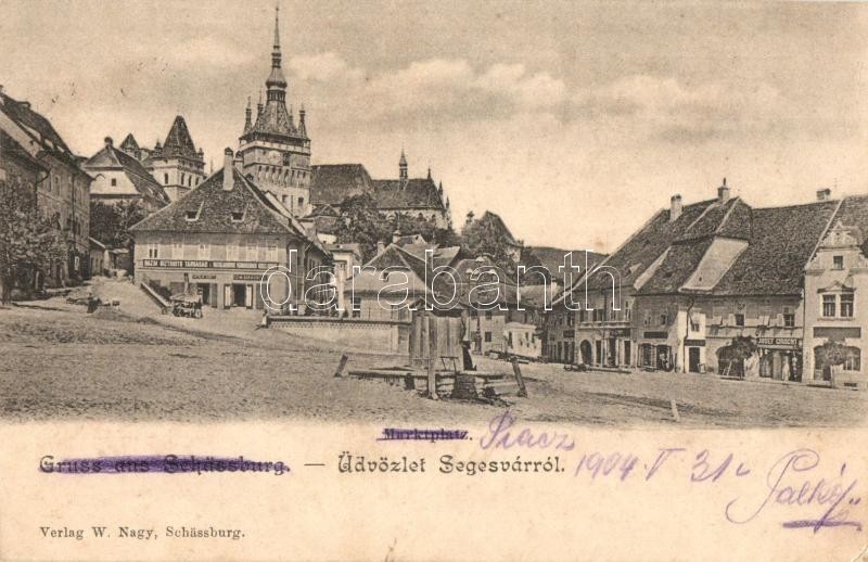 Leírás: 1904 Segesvár, Schassburg, Sighisoara; Piac tér, Hazai Biztosító Társaság, Josef és H. Girscht üzlete / market square, shops, insurance company (EK)