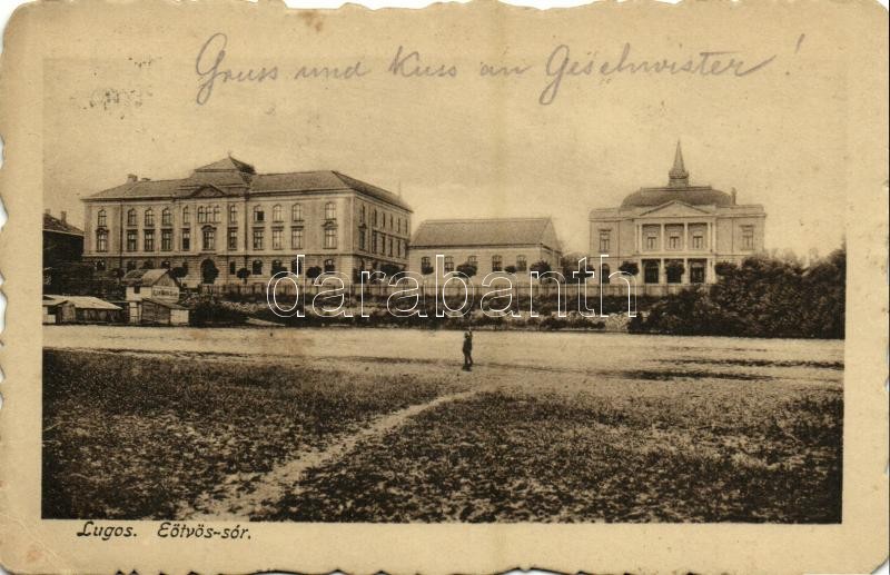 1916 Lugos, Lugoj; Eötvös sor, Főgimnázium, Színház, Klein Miksa üzlete. Kiadja Schönberg Miksané / street view, high school, theatre, shop of Klein (EK)