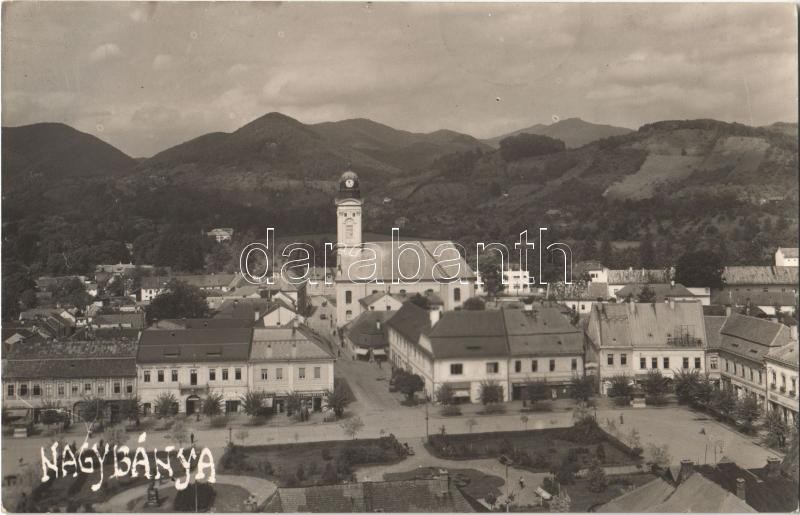 Leírás: 1940 Nagybánya, Baia Mare; Fő tér, templom, Ifj. Marosán Gyula üzlete / main square, church, shops. photo + "1940 Nagybánya visszatért" So. Stpl