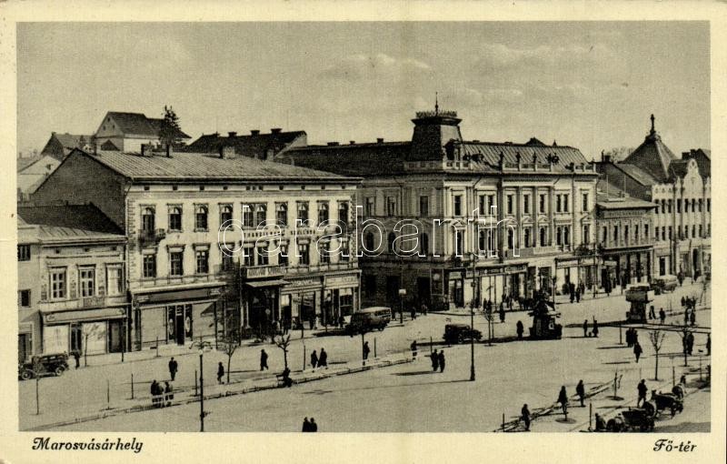 1943 Marosvásárhely, Targu Mures; Fő tér, Magyar Színház, Transilvania szálloda, Boskovics üzlete, autóbusz, automobil. Kiadja Révész Béla / main square, Hungarian theatre, hotel, shops, autobus, automobiles