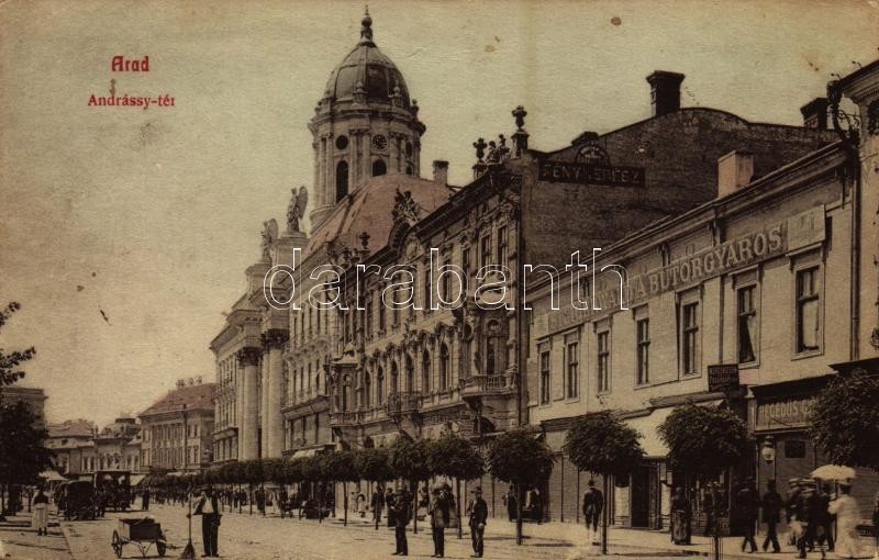 Leírás: Arad, Andrássy tér, Steigerwald A. Bútorgyáros, Morgenstern Gyula fogászata, Hegedűs Gy. és Geller L. üzlete / square, shops, dentistry