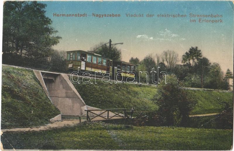 Nagyszeben, Hermannstadt, Sibiu; Viadukt der elektrischen Strassenbahn im Erlenpark / Villamos viaduktja az Erlen parkban. Kiadja Emil Fischer / tram viaduct in the park (szakadás / tear)
