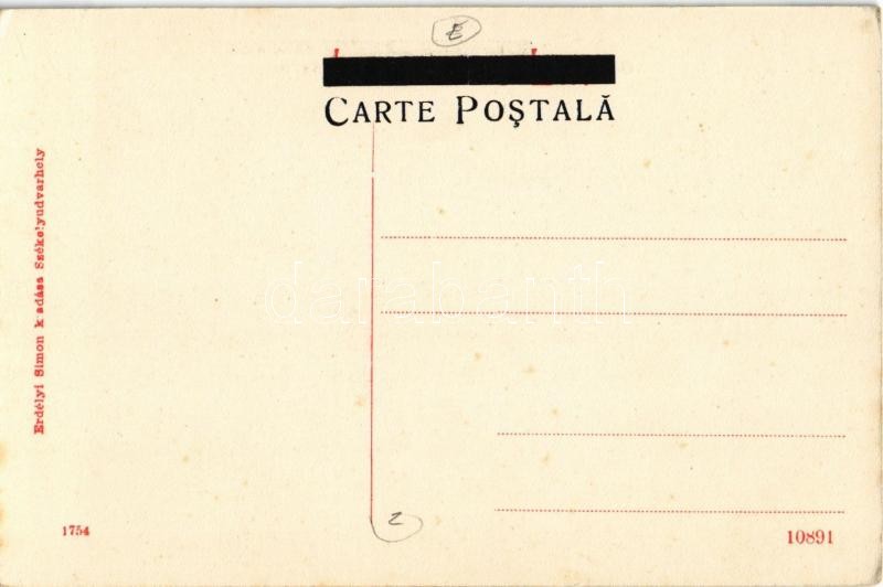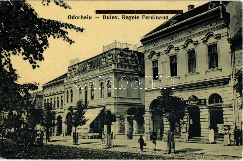 Székelyudvarhely, Odorheiu Secuiesc; Bulev. Regele Ferdinand / Kossuth utca (Ferdinánd király út), Budapest szálloda és kávéház, dohánybolt, üzlet. W. L. (?) 1754. Kiadja Erdélyi Simon / street view, hotel and café, tobacco shop (EK)
