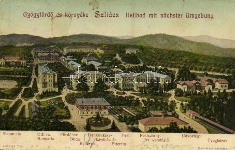 1908 Szliács, Sliac; Gyógyfürdő és környéke. Pannonia, Otthon, Hungaria, Fürdőház, Buda, Bellevue, Bristol, Újpest, Huszka vendéglő, Amália, Strauss, Dankovsky kávéház és étterem, Pest és Pestszárny szálloda, Izraelita (zsidó) vendéglő, Üdvözlégy, Üvegház kertész lak / spa, hotels, Jewish restaurant, greenhouse, café (fl)