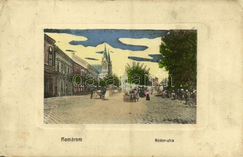 Leírás: 1911 Komárom, Komárno; Nádor utca, üzletek, piaci árusok. W. L. Bp. 5515. / street view, market vendors, shops (szakadás / tear)