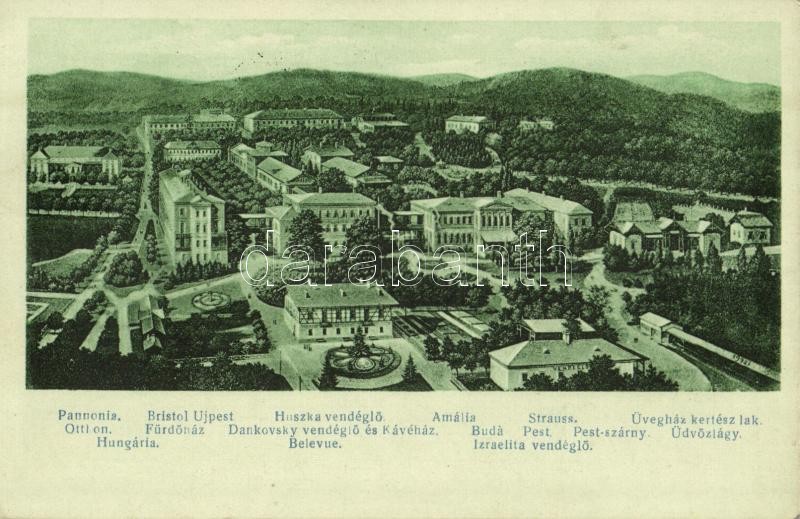 1914 Szliács, Sliac; Pannonia, Otthon, Hungaria, Fürdőház, Buda, Bellevue, Bristol, Újpest, Huszka vendéglő, Amália, Strauss, Dankovsky kávéház és étterem, Pest és Pestszárny szálloda, Izraelita vendéglő, Üdvözlégy, Üvegház kertész lak / hotels, Jewish restaurant, greenhouse, café
