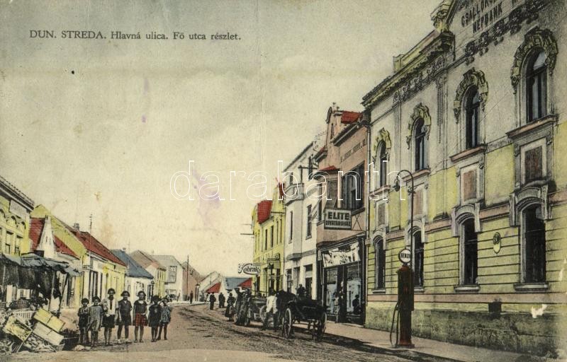 1934 Dunaszerdahely, Dunajská Streda; Hlavná ulica / Fő utca, Elite divatáruház, Kobrak üzlete, automobil, utcai benzintöltő állomás. Kiadja Goldstein Józsua / main street, fashion store, shops, automobile, gas filling station, petrol pump (fa)