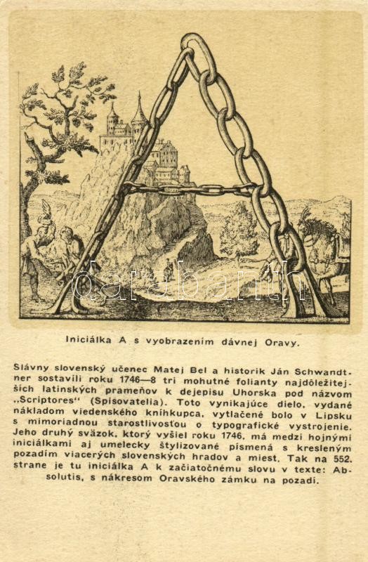 Árvaváralja, Oravsky Podzámok; Iniciálka A s vyobrazením dávnej Oravy / Iniciálés művészlap Árva ősi várával / art postcard with initials, depicting ancient Orava and Oravsky hrad castle