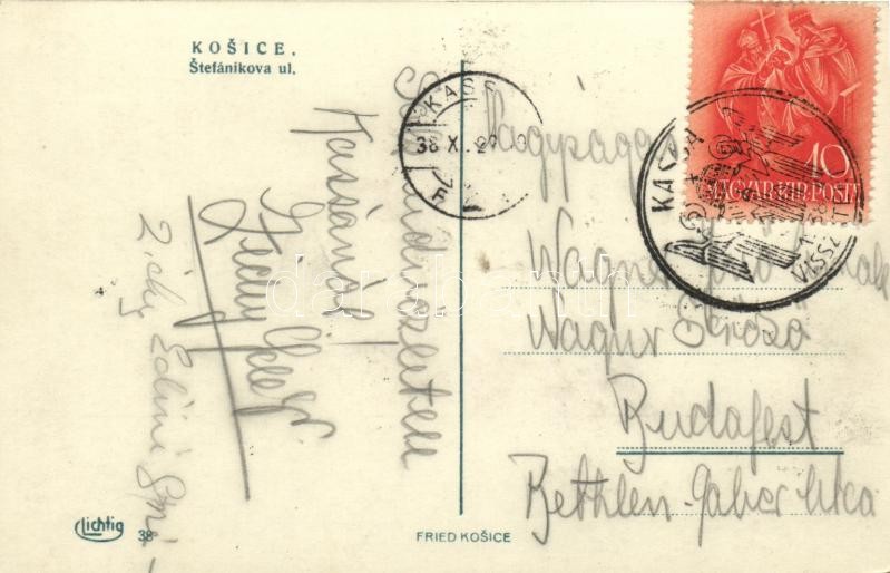 Leírás: Kassa, Kosice; Stefánikova ul. / Stefánik utca, Színház, Székesegyház, villamos, üzletek / street view, theatre, cathedral, tram, shops + "1938 Kassa visszatért" So. Stpl.