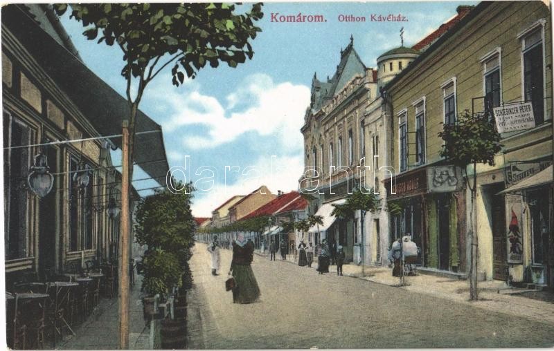Komárom, Komárnó; Otthon kávéház, Schlesinger Péter férfi szabó férfi és gyermekruha raktára, Deutsch Adolf üzlete, Spitzer Sándor üzlete és saját kiadása / cafe, shops