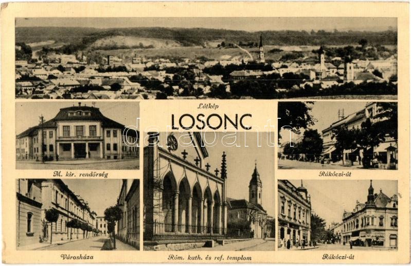 Losonc, Lucenec; Rendőrség, városháza, Rákóczi út, Római katolikus és ... https://www.darabanth.com/hu/360-Gyorsarveres/360.0/Kepeslapok/Felvidek~1000007/Losonc-Lucenec-Rendorseg-varoshaza-Rakoczi-ut-Romai-katolikus-es-reformatus-templomok~II1720800